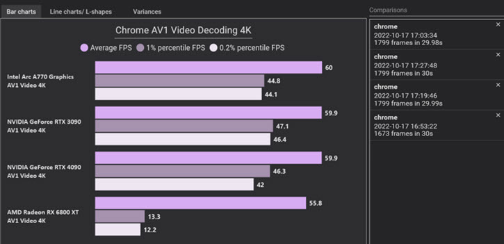 - Intel: Arc A770 consistently reaches the maximum 60 FPS for video playback.