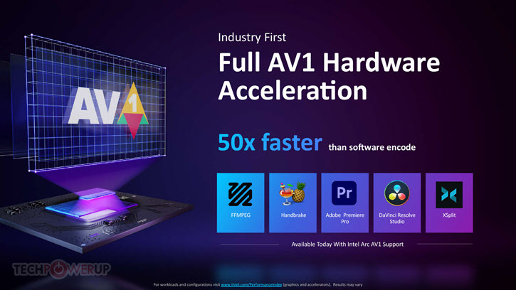 According to Intel, hardware encoding of AV1 on an Arc GPU can be up to 50 times quicker than relying solely on software. Furthermore, Intel asserts that AV1 encoding offers a 20% improvement in efficiency compared to HEVC at equivalent bit rates and is 50% more efficient than H.264.