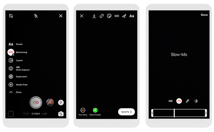 For people who want to loop a video on Instagram story by using the phone, you can go with the Boomerang feature of Instagram or the Boomerang app from Instagram. Both allow you to create a looping Instagram story video from 10 quickly captured still pictures. Head up, unlike VideoProc Converter AI and other video editors that allow you to loop an existing video for all sort of Instagram videos, Boomerang can only be used to record looping videos for Instagram story.