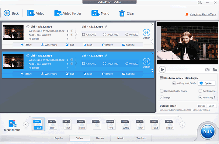 Step 4. Choose MP4 (H.264), and enable the Merge option under the preview window. Hit Run.