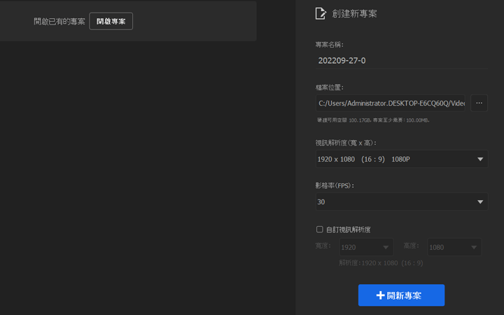 第 1 步. 建立一個新的專案(同時可設定影片規格)。