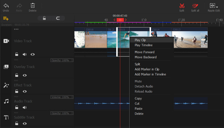 影片編輯:您可以拖曳並將影片在時間軸上重新排序,本軟體預設支援波紋編輯。您可預覽影片,並同時選擇要刪除的開始/終結點。同時,也可以在時間軸上任一處右鍵點擊並選擇在片段中增加標記,點擊工具中的分割,並按下鍵盤的 Delete 鍵來刪除片段。如要批次的刪除欲捨棄的片段,您可以先將影片分割,接著按住 Ctrl 並選擇這些片段,並按下鍵盤的 Delete 鍵來刪除片段。