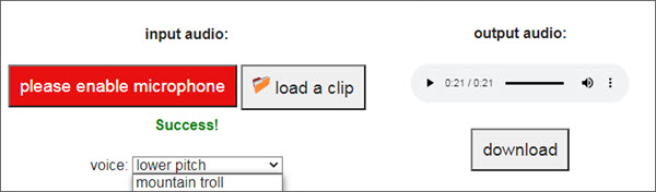 Voice Spice allows you to quickly adjust the pitch slider, record your voice directly within the browser, and download the altered sound. Besides female and male voice changer, you can choose Space Squirrel, Robot and Hell Demon effects. It also has a text-to-speech generator, where you can input scripts and choose a voice for it. You can use it as a workaround way to change your voice and dub for a video.