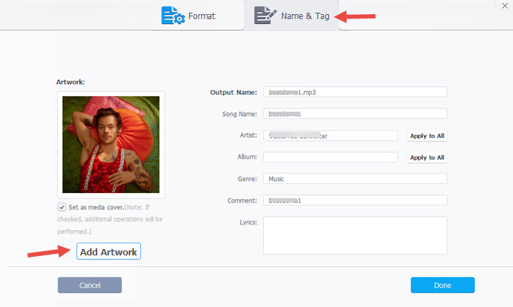 Tips: In the same interface, you can add artist to MP3, adjust music track name, album name, genre, lyrics, etc.