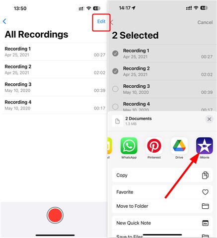 Step 1. Go to your Voice Memo app, tap on Edit button from the right top corner, then select the voice memos you want to combine and tap on the Share button on the left side corner. Then tap on Files to save your voice memos.
