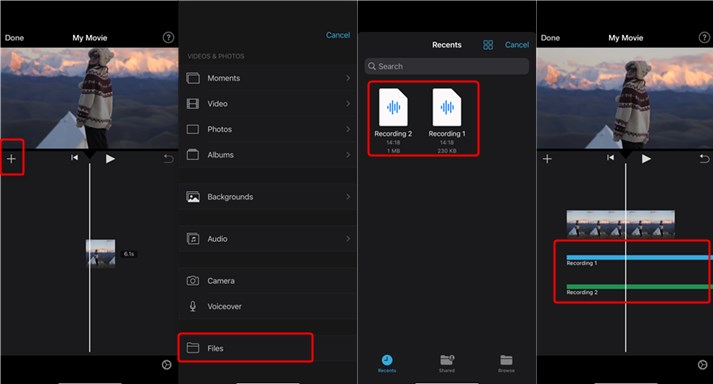 Step 2. Open iMovie or any other audio editing apps you installed on your iPhone.Tap on Create a New Project to mport a video or picture to your project. Then click the + icon - Files - choose your voice memos - add it to your timeline. Then you can trip, split, or change the volume of your voice memos. Click Done > Share > Save Video to combine voice memos on iPhone easily.