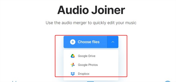 Step 1. Open Clideo's Auido Meger on your browser and click on Choose files to upload your voice memos here. You can also import your voice memos from Google Drive, Google Photos, and Dropbox.