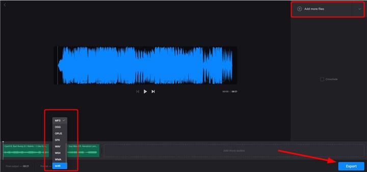 You can click Add more fles to import multiple voice memos here. It supports exporting your voice memos in many formats like MP3, OGG, AAC, M4R, AC3, AIFF, M4A, etc. Click Export button to