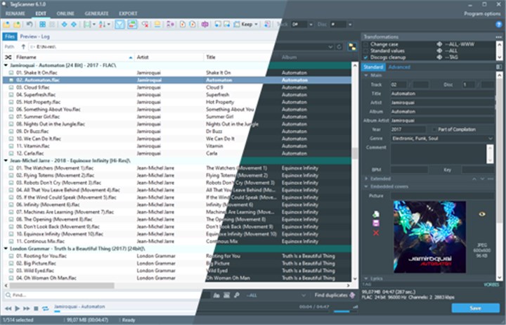 Using online databases like Discogs, MusicBrainz, and Freedb, TagScanner can tag your audio files automatically. This means changing the metadata for your full music collection is simple and only needs a few clicks. Additionally, TagScanner provides a variety of manual tagging choices that make it simple to change metadata such as the music title, artist, album, and more. Additionally, you can add custom tags, there are more comprehensive choices like the capacity to create specific scripts to perform tasks automatically.