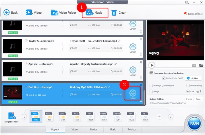 Step 2. Click +Music to upload your MP3 audio from computer. You can also drag and drop your music files here.Then click the Codec Option button to continue.