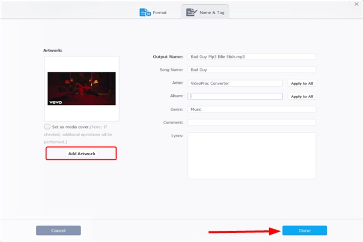 Step 3. Then you can edit your MP3 tags like output name, song name, artist, album, genre, comment, lyrics, etc. You can also add your own artwork to set it as media cover.