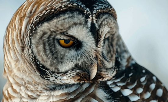 Prompt 1: close-up portrait of a great horned owl, piercing yellow eyes, in the style of Canon EOS R5, 8K resolution, muted earth tones, Canon RF 100-500mm f/4.5-7.1L lens, realistic feather details --ar 16:9 --style raw