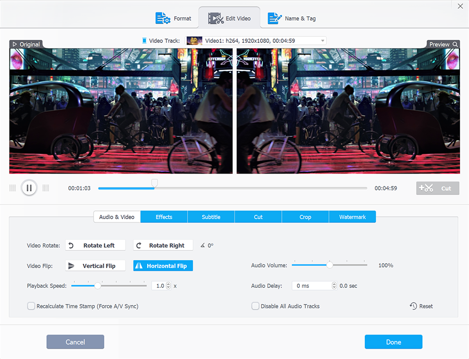 "VideoProc Converter ist eine Videobearbeitungssoftware, die Hardware-Beschleunigung nutzt, Windgeräusche entfernt und verwackelte Aufnahmen stabilisiert."