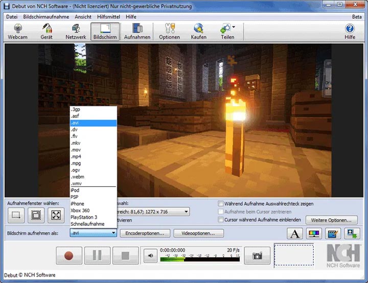 Debut ist ein leistungsfähiger MP4-Videorekorder mit den standardmäßigen Funktionen, die man von einem Bildschirmrekorder erwarten würde. Das Programm bietet Optionen, um den gesamten Bildschirm, ein ausgewähltes Fenster oder einen beliebigen ausgewählten Bereich aufzunehmen. Sie können auch Video-Overlay verwenden, um Ihren Bildschirm und Ihre Webcam gleichzeitig aufzunehmen. Außerdem ermöglicht es die Aufnahme von einer Netzwerk-IP-Kamera oder einem Videoeingabegerät. Debut bietet außerdem die Möglichkeit, den Cursor anzuzeigen oder zu verbergen und ihn beim Klicken hervorzuheben, was nützlich für die Aufnahme von Tutorials ist.