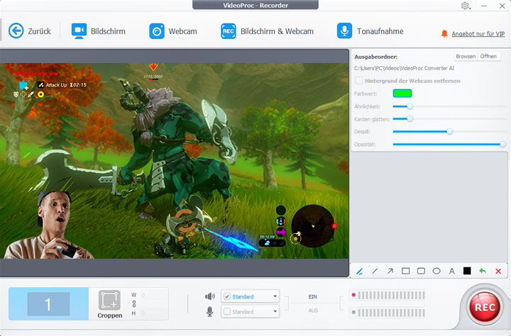 VideoProc Converter AI ist eine Videobearbeitungssoftware mit einem integrierten Bildschirmrekorder. Und in der Tat funktioniert der Videorekorder reibungslos. Er ist einfach zu bedienen, aber leistungsstark genug, um Gameplay, Video-Tutorials, Webinare, Podcasts und vieles mehr aufzuzeichnen.