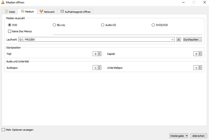 VLC ist ein bekannter Medienplayer, der sowohl auf Computern als auch auf mobilen Geräten verfügbar ist. Er unterstützt eine breite Palette von Medienformaten, natürlich auch Discs. Sie können mit VLC DVDs, Blu-rays, Audio CDs und SVCD/VCDs öffnen und sie in MKV, MP4, TS usw. konvertieren. Da er DVDs nicht mit intelligenten Voreinstellungen rippt, müssen Sie die Einstellungen für Codecs, Auflösung und Bildrate manuell anpassen und Titel, Audiospur und Untertitelspur auswählen. Um DVDs/Blu-rays in der Originalqualität zu rippen, müssen die Ausgabeeinstellungen mit dem Quellinhalt übereinstimmen, daher müssen Sie die Quellinformationen genau kennen.