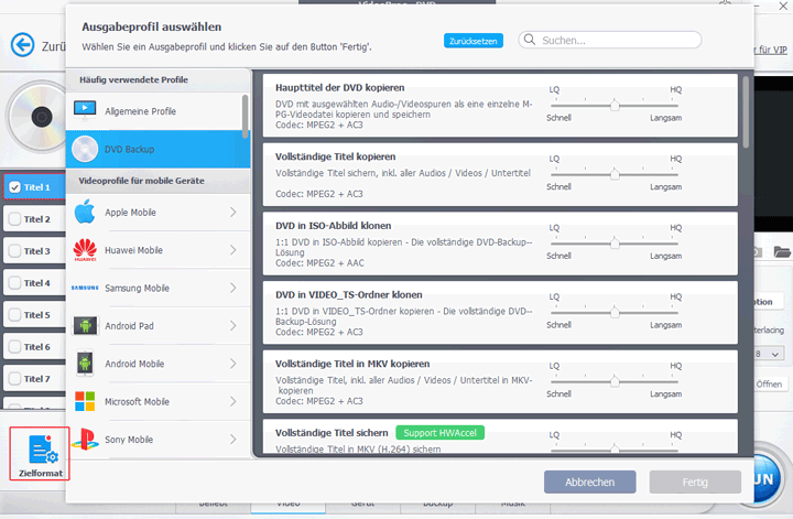 VideoProc Converter AI bietet unter "Zielformat" auch Voreinstellungen für eine bestimmte Verwendung, sortiert nach Gerät und Plattform. Wenn Sie eine digitale Kopie erstellen möchten, ohne dass Daten auf Ihrer Disc verloren gehen, wählen Sie "DVD Backup".