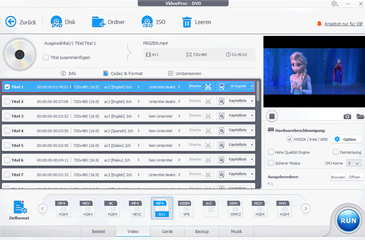 - Konvertiert DVDs in MP4, MKV, AVI, ISO, VOB, Video_TS und 370+ Formate