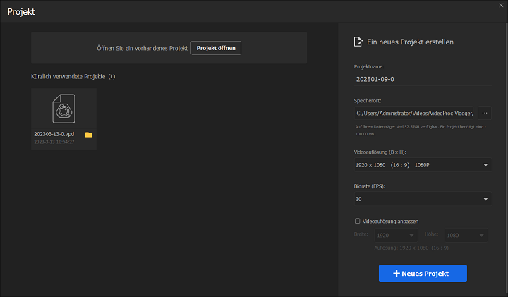 Starten Sie VideoProc Vlogger auf Ihrem PC. Nehmen Sie einige einfache Einstellungen vor (Projektname, Speicherort, Auflösung und Bildrate) und klicken Sie auf die Schaltfläche "Neues Projekt", um in den Hauptbearbeitungsbereich zu gelangen. Sie können auch die Standardeinstellungen beibehalten, um schnell loslegen zu können.