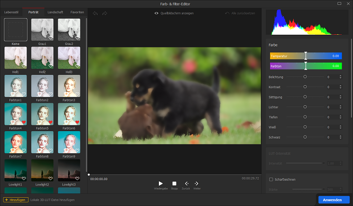 Für ästhetischere Filter können Sie den Farbeditor öffnen, um integrierte 3D-LUTs hinzuzufügen oder einige von Stock-Websites herunterzuladen.