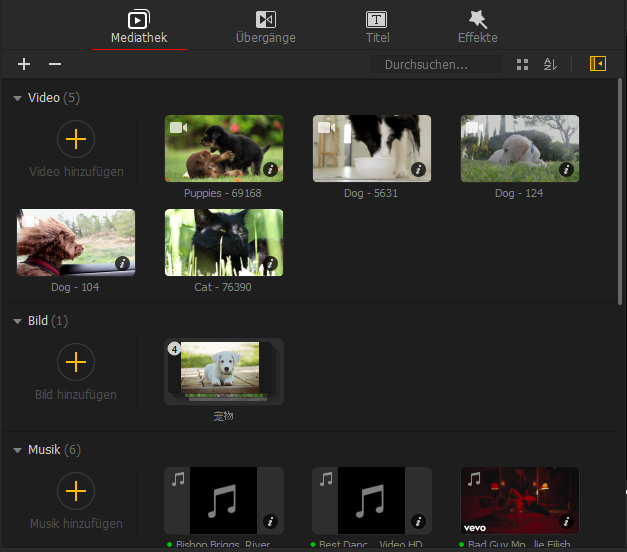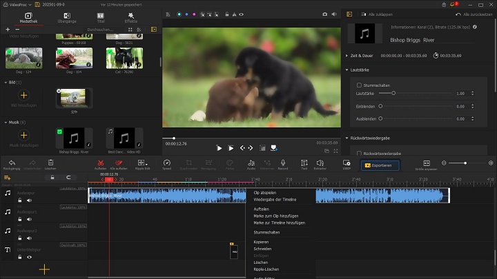 Ziehen Sie einen Song oder die Dateien mit den Soundeffekten von Ihrem Computer in die Medienbibliothek und verschieben Sie sie in die Audiospur. Nun können Sie sie in der Timeline verschieben, ausschneiden und löschen, wie Sie es in der Videospur getan haben.
