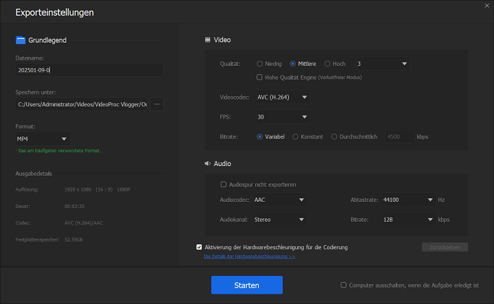 Sie können das Projekt speichern und beim nächsten Mal mit der Bearbeitung fortfahren. Oder klicken Sie über der Zeitleiste auf "Exportieren", nehmen Sie die Einstellungen für Videospeicherort, Dateiname, Format und Qualität vor und aktivieren Sie dann die Hardwarebeschleunigung. Klicken Sie auf "Start", um das Video zu rendern und auszugeben.