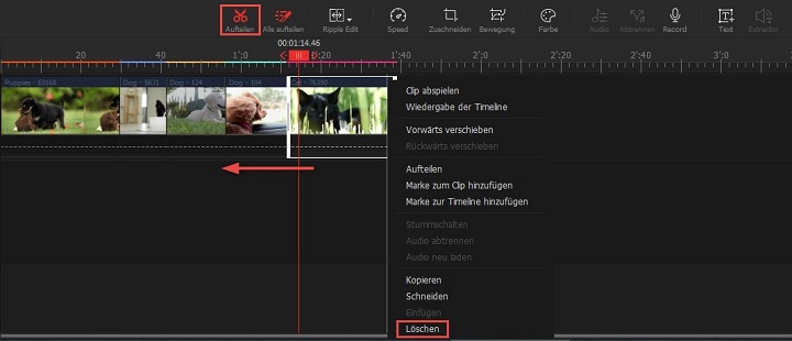 - Überflüssiges Filmmaterial löschen: Klicken Sie, um den Clip auszuwählen, und drücken Sie die Löschtaste über der Zeitleiste, um ihn zu entfernen.