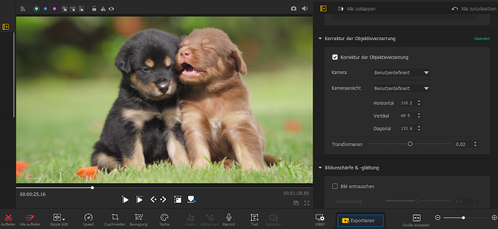 Klicken Sie in der Zeitleiste auf den Clip. Scrollen Sie im Inspektor-Bedienfeld neben dem Vorschaufenster nach unten. Dort finden Sie die Option "Linsenverzerrungskorrektur". Aktivieren Sie das Kontrollkästchen, um die Funktion zu aktivieren. Wählen Sie ein Kameramodell und eine Kameraansicht aus und passen Sie dann die Transformation an, um optional die Linsenverzerrung zu korrigieren.