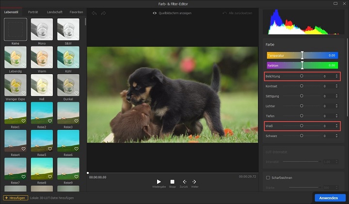 Öffnen Sie den Farbeditor in der Symbolleiste. Ziehen Sie den Schieberegler für Weiß nach links und dann für Belichtung. Sie können die Ergebnisse im Vorschaufenster und im Histogramm überwachen und die Einstellungen jederzeit zurücksetzen. Klicken Sie auf "Übernehmen", um die Änderungen zu speichern und zur Hauptbenutzeroberfläche zurückzukehren.