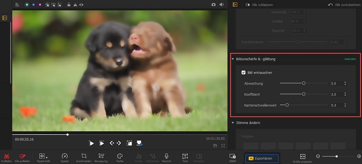 Erweitern Sie im Inspektor die Option "Bildunschärfe und -glättung", aktivieren Sie die Bildglättung und passen Sie die folgenden Optionen an, um das Bildrauschen zu reduzieren.