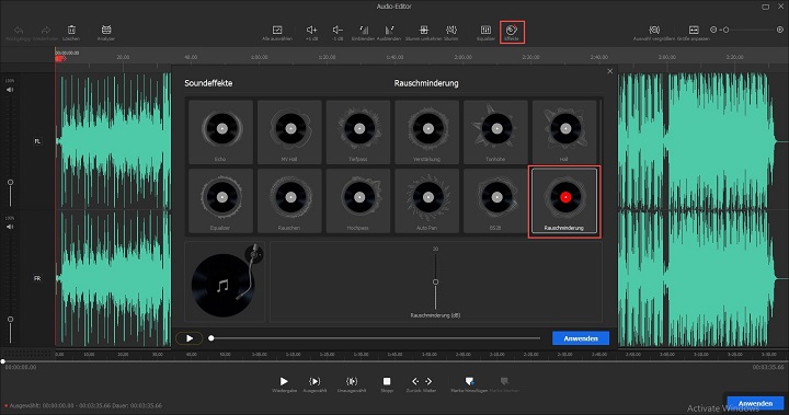 Trennen Sie den Ton vom Filmmaterial. Klicken Sie auf Audio > Effekte > Rauschunterdrückung, um das Hintergrundrauschen zu reduzieren. Alternativ können Sie den Ton, wie das Windgeräusch, stummschalten und durch ein Musikstück ersetzen.