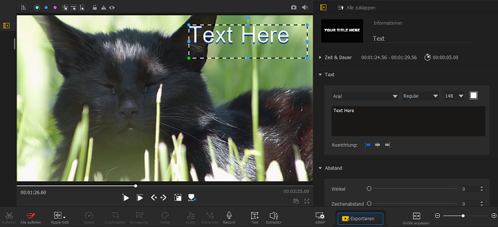 Klicken Sie über der Zeitleiste auf die Option "Text" und geben Sie Texte in der gewünschten Schriftart, Farbe, Größe und Position ein.