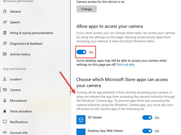 Schritt 2. Klicken Sie in der linken Seitenleiste auf die Option "Kamera" > Aktivieren Sie "Apps den Zugriff auf Ihre Kamera erlauben".
