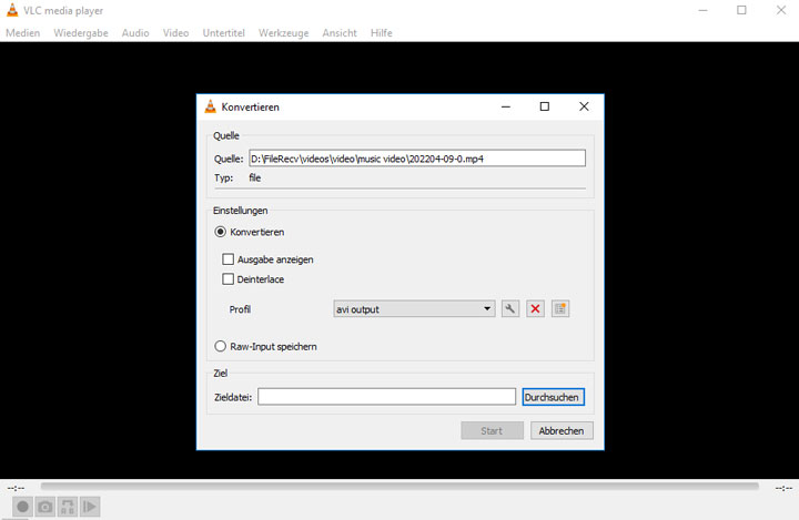 Schritt 5. Beenden Sie die Einstellungen der Zieldatei und beginnen Sie mit der Umwandlung von MP4 zu AVI in VLC.