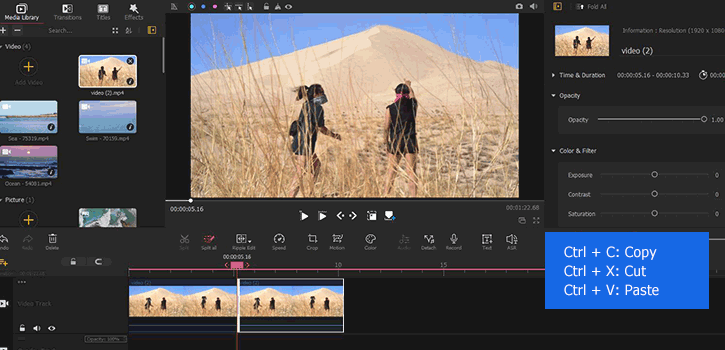 If you want to duplicate a certain video, audio, overlay, or subtitle clip, select the target clip on the timeline and press Ctrl + C.