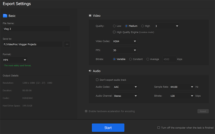 You can mute original sound and add music and do other editing. After all done, just click Export in theToolbar of VideoProc Vlogger to export your video.