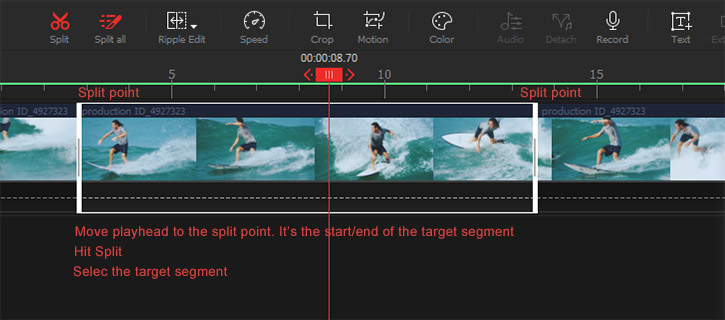 Let's select the target video in Timeline > click the Play icon in the Preview panel. After that, the red playhead will move in Timeline to preview the video > hit the Stop icon in Timeline to locate the start point where you want to add zoom. Tap Split in Toolbar. Then, split the end point where you want to add zoom in the same way. Now you get the segment for zoom.