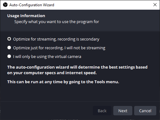 OBS provides an Auto-Configuration Wizard to help users navigate through the initial setup process. It will pop out when you first open the software. This wizard tailors its configuration advice according to your specific system and requirements.