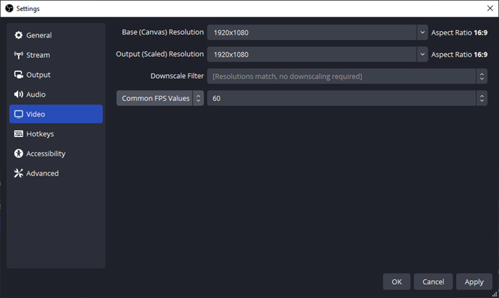Base (Canvas) Resolution determines how much space you have for your sources. You usually want this to match your monitor display resolution to get the full screen. Output (Scaled) Resolution should be the Stream Output Resolution. These two are often set to be the same. The downscale filter is only required when the two resolutions do not match, like when you want to convert 4K to 1080p. Usually, you can choose the Bicubic Downscale Filter if needed.