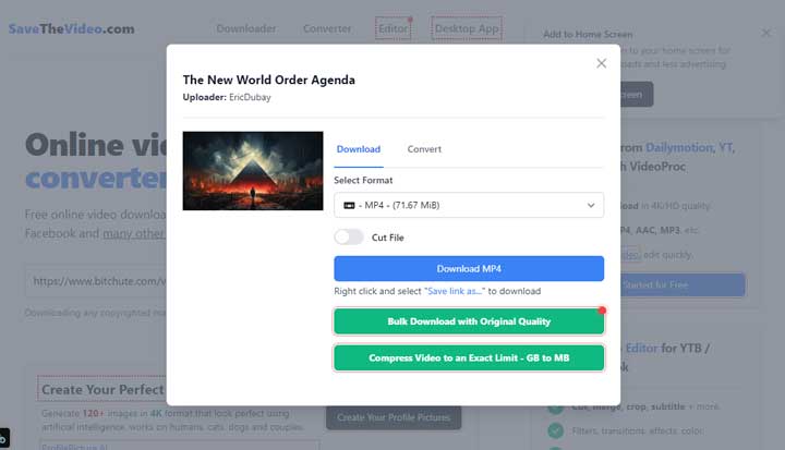 SaveTheVideo is an online video downloader that supports fetching videos from BitChute, Vimeo, TikTok, Twitch, and many other popular video-sharing and social media platforms. You can download videos in bulk from the BitChute link that contains multiple videos. The tool allows you to convert videos to popular formats like MP3, M4A, and WebM. Additionally, you have the option to select specific parts of a BitChute video for downloading. However, please note that this online BitChute downloader does not offer 4K UHD quality downloads. Since the service is free, it relies on advertising to cover its operational costs, resulting in frequent pop-up ads.