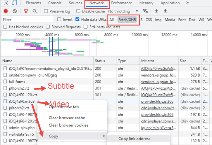 Step 4. You shall see an .m3u8 item under the Name column. Right-click on the .m3u8 and hover to Copy > Copy link address.