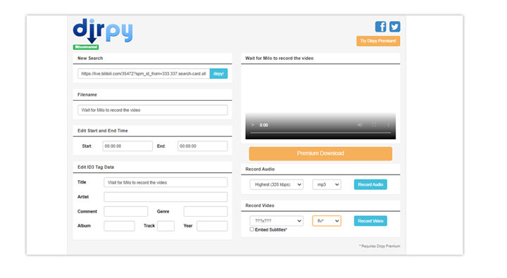 Free Online Video Downloader, now part of DIRPY, is another decent piece of online FLV downloader that lets you download FLV videos. It supports 40 video distribution sites including Reddit, Facebook, Twitch, Twitter, Vimeo, Bilibili, Bitchube, and Tumblr. Before downloading the video, you can edit the tag data, set the target audio bitrate, specify the video resolution, adjust the video format, etc. However, to save the downloaded video file in the FLV format or download any video longer than 20min, you have to upgrade your account to premium.