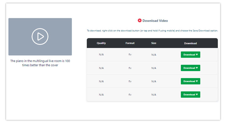 YouTube4KDownloader is a free & online FLV downloader that allows you to download FLV videos from over 900 sites including popular sites like YouTube and Twitch and the less known ones like KinjaEmbed and SendtoNews. You're allowed to download the FLV video in 1080P and 720P resolution. You can even save the FLV video without sound or keep only the soundtrack of the FLV video. What we dislike most about YouTube4KDownlaoder is it displays too many misleading ads and pop-ups.