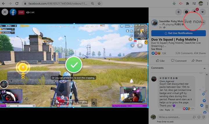 Click "Crop" on the lower side, and drag the box to record the playback window of the streaming live on Facebook. And do not forget to enable the system sound. Now hit the red button to start recording the video.