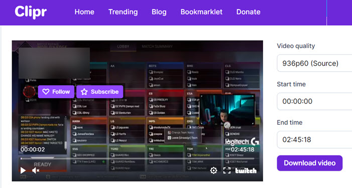 Clipr is a concise online tool to download Twitch VOD videos. You can head over to Twitch.tv page, find a VOD video you want, and copy & paste the link to Clipr.xyz website. After hitting the purple Download button, it will offer you video resolution options. Another nice feature is, you can set the video start and end time before downloading.