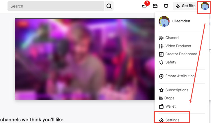 Go to twitch.tv, log in, and open the drop-down menu by clicking on your avatar, there you shall see the Settings option.