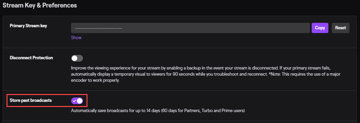 Twitch platform offers you the option to auto-save the broadcasts to its server, and provides general users a 14-day time frame to the saved VODs (premium users have up to 60 days).