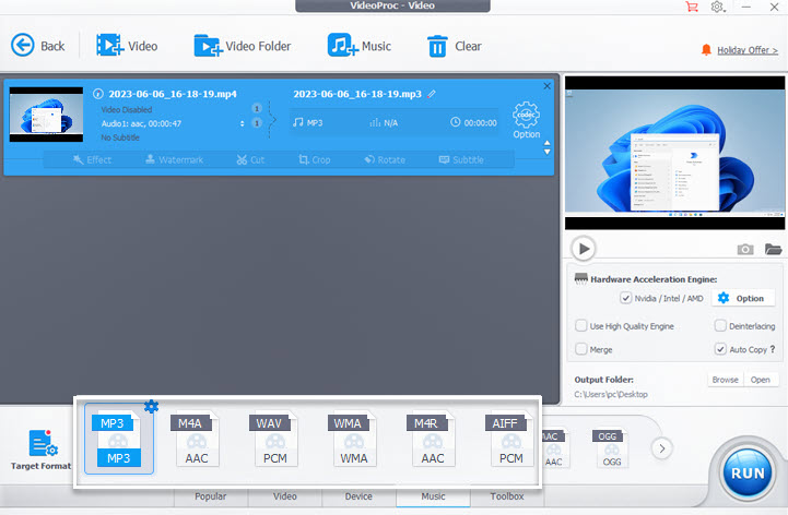 If you want to record what you hear, such as system sounds, audio playing on your computer, voice from microphone, or anything audio, you will find VideoProc Converter AI an overall best choice.