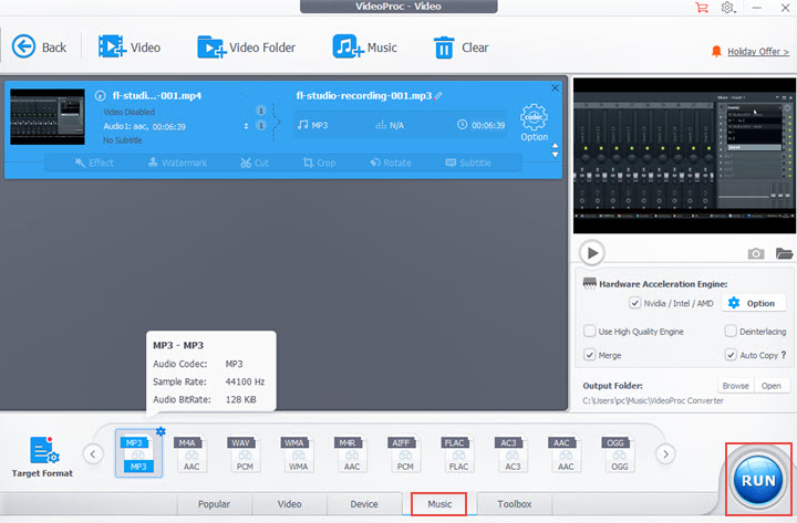 Step 5. Select "Video" on its main interface. Drag and audio the screen recording to it. Select an audio format in the "Music" tab at the bottom. Click "RUN" to export the FL Studio audio recording to your computer.