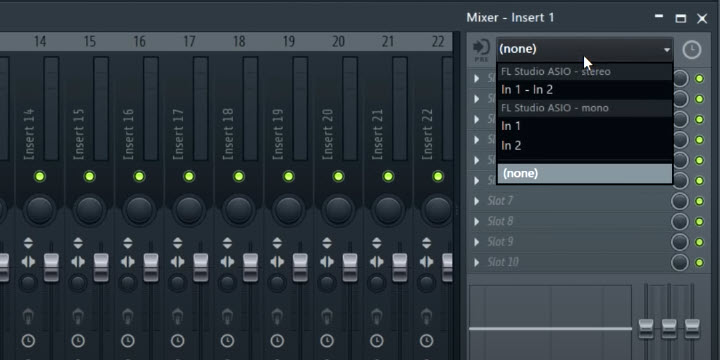 Move to the "Mixer – Insert" tab and select the input signal that you want to record, from a microphone, an MIDI, or an instrument.